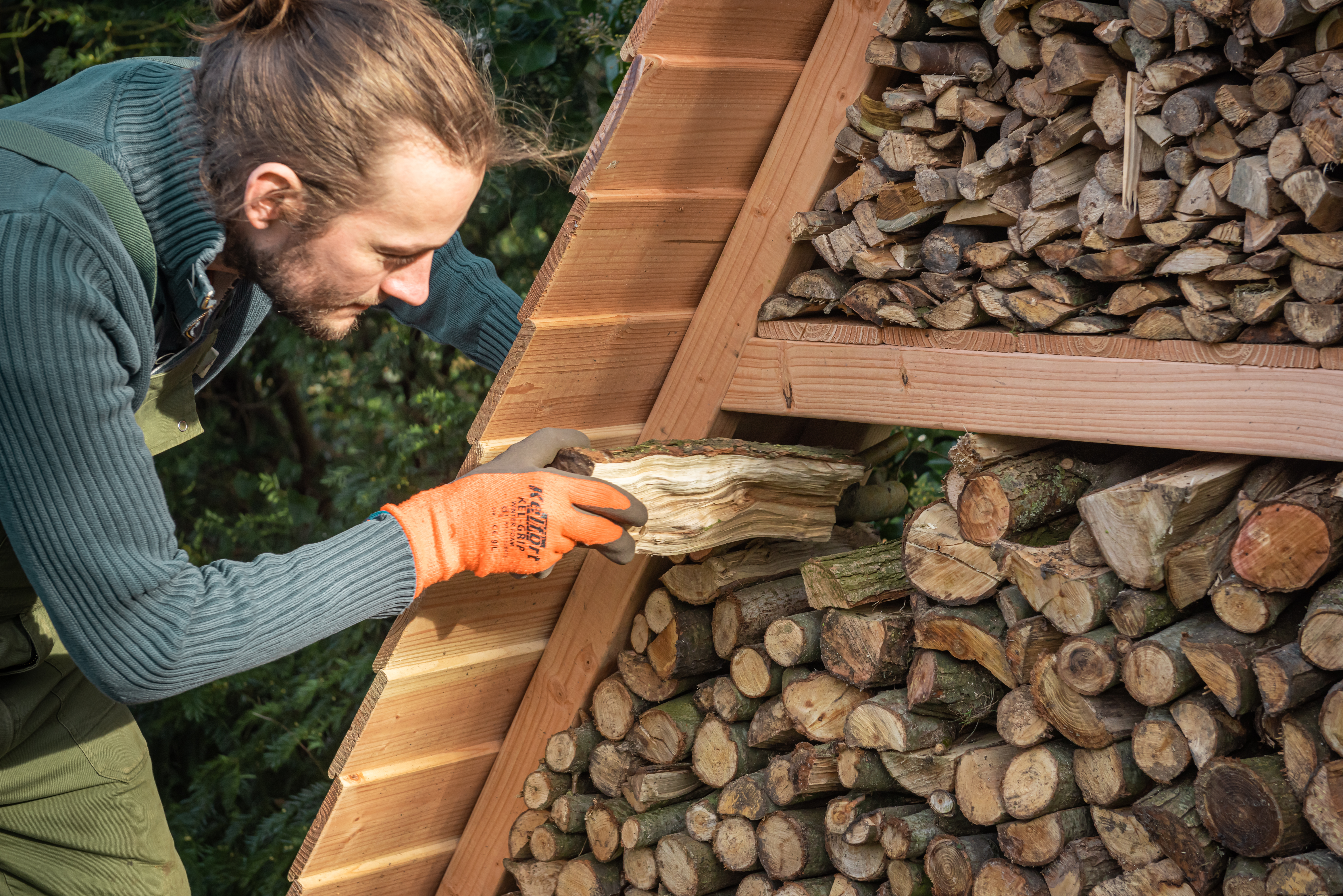 Met deze driehoekige haardhoutopslag berg je niet alleen heel eenvoudig je houtblokken op, maar verfraai je in één moeite door
