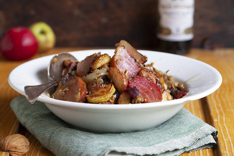 De appels worden kort gebakken waardoor ze iets karamelliseren. Maak de salade af met een dressing van goede balsamicoazijn en