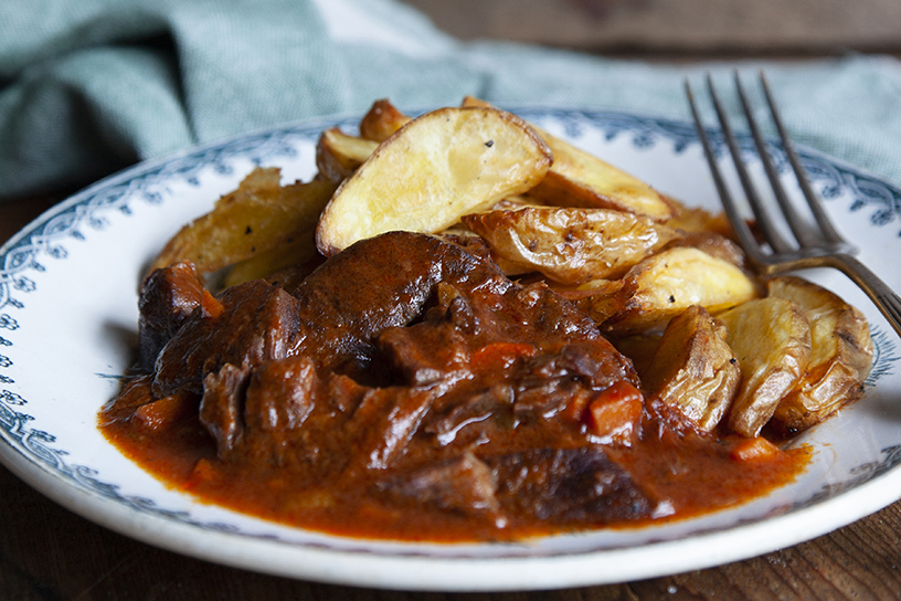 Een maaltijd met een knipoog naar stoofvlees met friet, alleen maakt je de aardappeltjes met schil in de oven. De