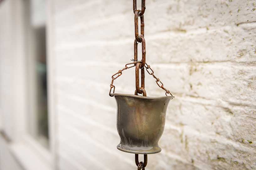 Hang een regenwaterketting aan je dakgoot. Dit alternatief voor de gewone regenpijp is een decoratieve manier om regenwater af te