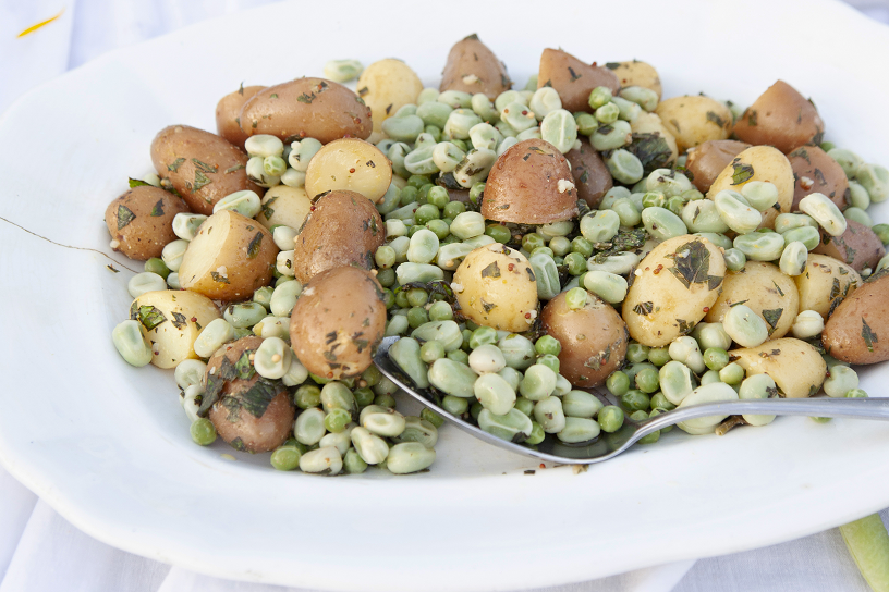 Een salade die u het beste geeft van de nieuwe oogst uit de moestuin: de eerste aardappels, tuinbonen en doperwten!