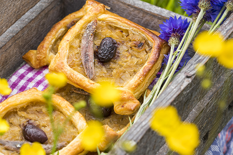 Op een heerlijke zomersedag picknicken in het gras. Vul je mand met deze heerlijke uientaartjes met ansjovis. Een keer wat