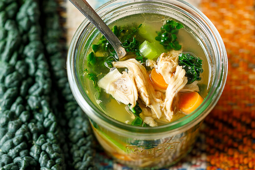 Een goede kippensoep werkt altijd goed om mee op te warmen. Deze soep is extra lekker door de palmkool. Een