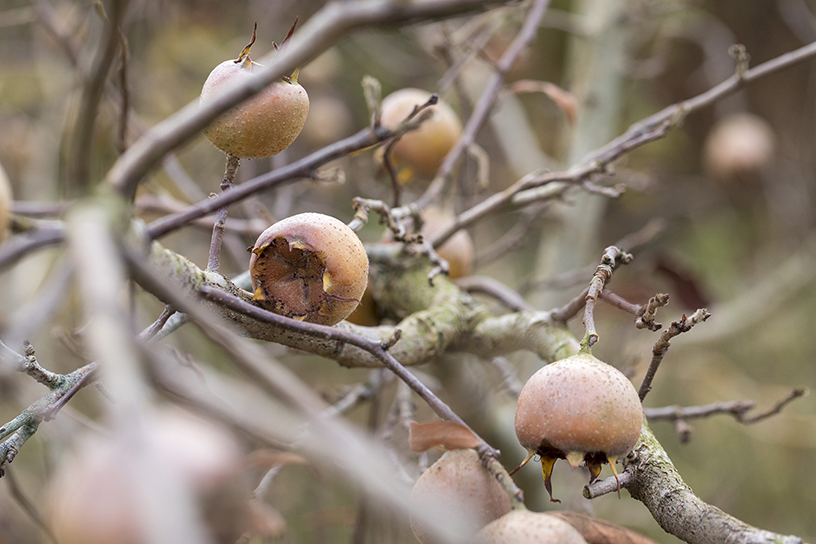 De mispel is een bijzonder boompje. In het voorjaar is hij prachtig versierd met witte bloesem en in het najaar