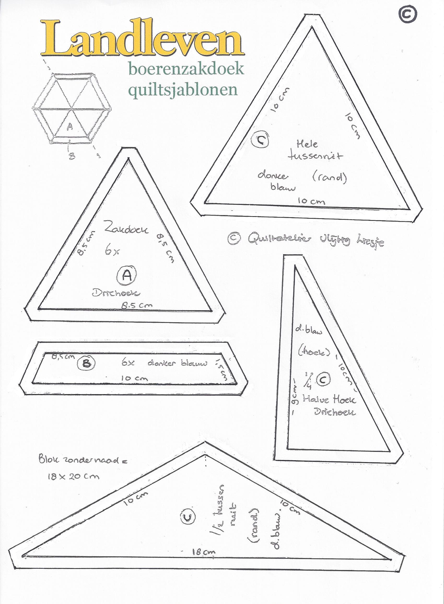 Maak mallen van de sjablonen A, B en C van stevig plastic (paternoplaat). De naad is al inbegrepen in de sjablonen en hoef je er niet bij te tekenen. Knip per blok zes driehoeken A uit de rand van een boerenzakdoek. Doe dit zo, dat het motief in elk van de zes punten exact gelijk is van boven tot onder.