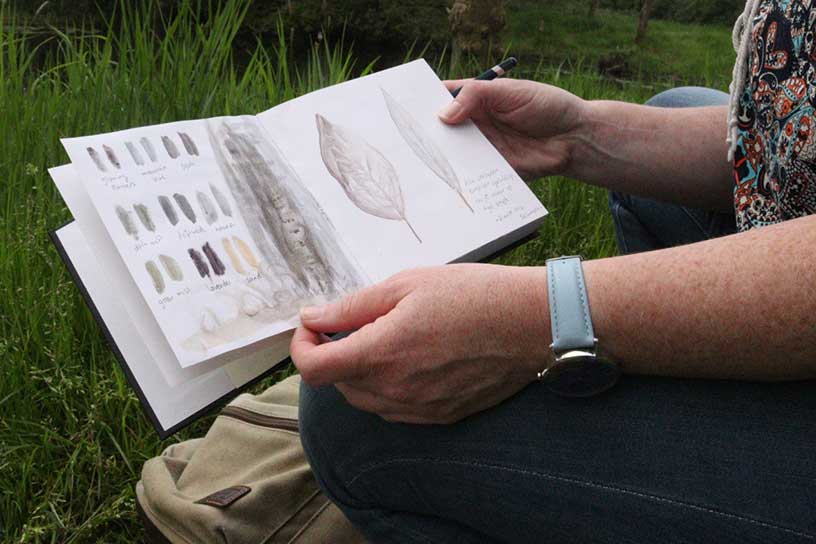 Tijdens het struinen gaat het vooral over gebruiken wat je vindt, wat je al hebt en over hergebruik.” Lisette verzamelt verschillende natuurvondsten, zoals veren of stenen, maakt foto’s, schetsen of schrijft. Deze vondsten neemt ze mee naar haar atelier en dan krijgt het een verhaal. Deze vondsten combineert ze met een wisselende mix van allerlei soorten media en technieken. “Ik gebruik vaak potlood, krijt, houtskool, textiel of zelfgemaakte natuurinkt en aquarelverf. Op deze manier creëer ik laag voor laag een verhaal.” De technieken die ze graag gebruikt zijn collage en mixed media. Bij collage voeg je meerdere beelden samen tot een nieuwe beeld en bij mixed media gebruik je verschillende materialen en technieken door elkaar.