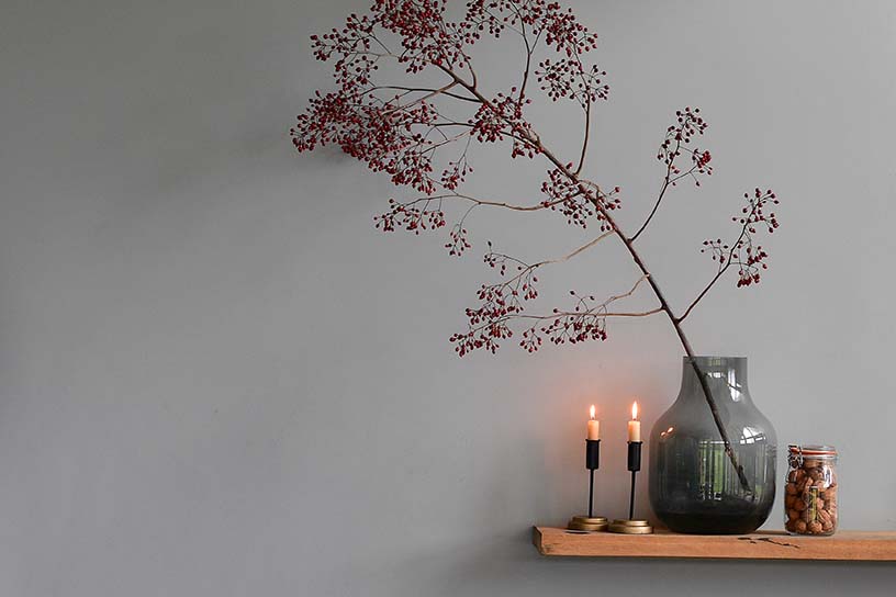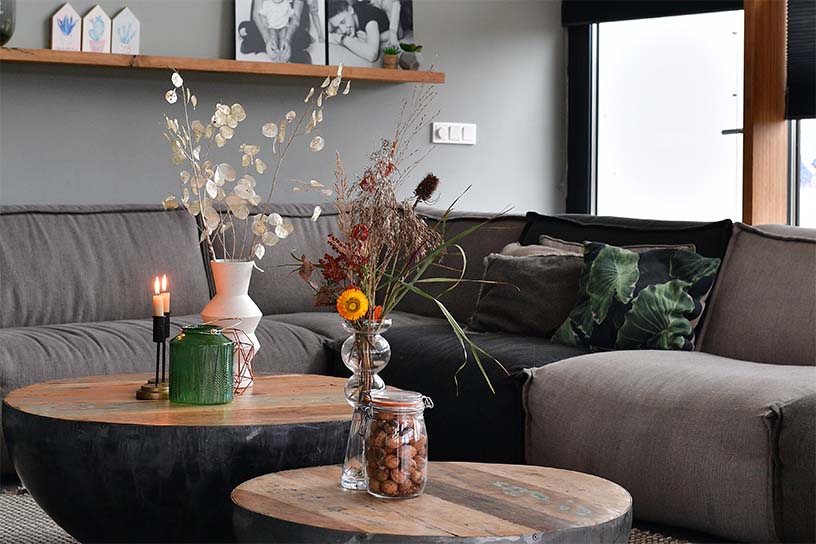 Aardse tinten geven het huis een rustige en relaxte uitstraling. Als accessoires heeft Heidi gekozen voor natuurlijke materialen, zoals een tak rozenbottels in een vaas van rookglas.