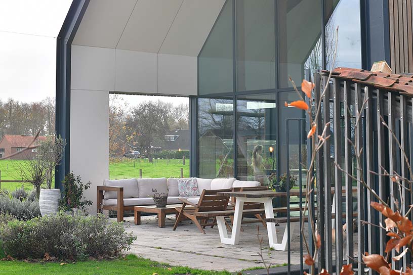 Het gezin Van Oort telt zes kinderen: Gijsbert, Corneel, Lente, Silas, Venne en Danée. Tel daar Heidi en haar man Rijk bij op én hond Novi en je komt op negen bewoners. Een gemiddeld huis kan dan aardig krap aanvoelen, maar daarvan is geen sprake bij dit familiehuis in Ederveen. “Wij hebben een eigen aannemersbedrijf”, steekt Heidi meteen van wal. “En we hadden al lang het idee om samen met een vriend, die compagnon is bij een architectenbureau, iets te bouwen. Toen dit perceel van zevenduizend vierkante meter te koop kwam, hebben we het erop gewaagd. De bestemming van het perceel was agrarisch, hier stond vroeger een kippenbroederij. Daardoor kwam er wel van alles bij kijken. Het bestemmingsplan moest eerst gewijzigd worden.