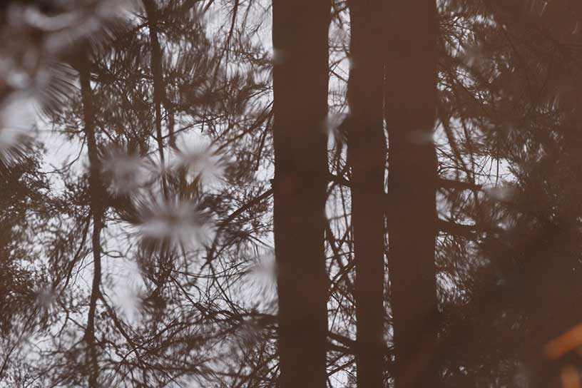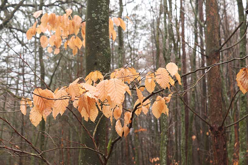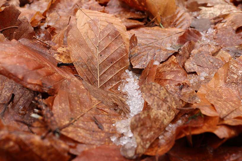 De condens uit mijn mond is duidelijk te zien. Aan sommige bomen hangen nog een paar bruine, dode blaadjes aan de takken. Deze blaadjes gaan er binnen de kortste keren een keer afvallen, want verder zijn er geen blaadjes aan de bomen te zien. Het lijkt wel alsof ze aan een zijden draadje hangen. De blaadjes waaien een beetje heen en weer. Als ik lang blijf staan zie ik soms een blaadje vallen. Op deze dag in maart heeft het spreekwoord zichzelf zeker waar gemaakt. In maart kan het weer nog erg winters zijn. Gekeken naar de takken hangen hier druppels condens aan. De kou die aan het begin van de wandeling te voelen was, is ook te zien in en aan de natuur.