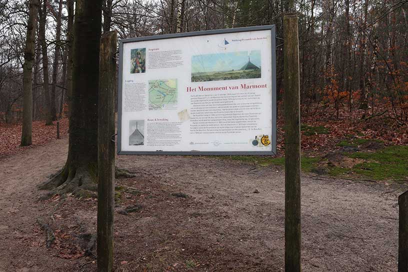 De wandeling over de Marmontberg op de Utrechtse Heuvelrug is een 5 km lange wandeling. De auto heb ik geparkeerd bij de piramide van Austerlitz. Hier staat de enige piramide van Nederland. Deze kun je op zondag beklimmen en je geniet dan van een prachtig uitzicht. Hier is ook een speeltuin en worden kinderfeestjes gehouden. Op het informatie bord bij de parkeerplaats staan verschillende wandelingen beschreven aan de hand van tijd. Vandaag kies ik de wandelroute de Marmontberg die zich in het landgoed Den-Treek-Henschoten bevind.