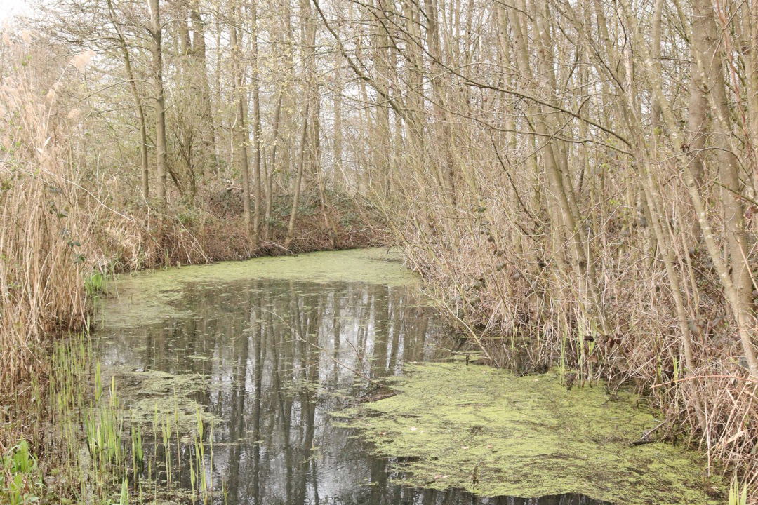 Bij het startpunt kun je kiezen om links- of rechtsom het pad te volgen. Ik kies ervoor om het laarzenpad linksom te gaan volgen en loop hierdoor direct langs het water: de Nevelhorst. Je loopt over een lager gedeelte langs het water richting de achterkant van de Nevelhorst. Dit verlaagde gedeelte is rond 1959-1960 afgegraven voor de aanleg van de huidige snelweg A12. Voor de oorlog was hier geen water maar lag over dit gebied een zandrug van 13-14 meter hoog boven N.A.P. Vroeger werd dit ’t Hoge Veld genoemd. Hier en daar staan verschillende visserstenten langs het water. De hengels hangen al uit. Er is dus, naast de eenden, nog leven in dit water.