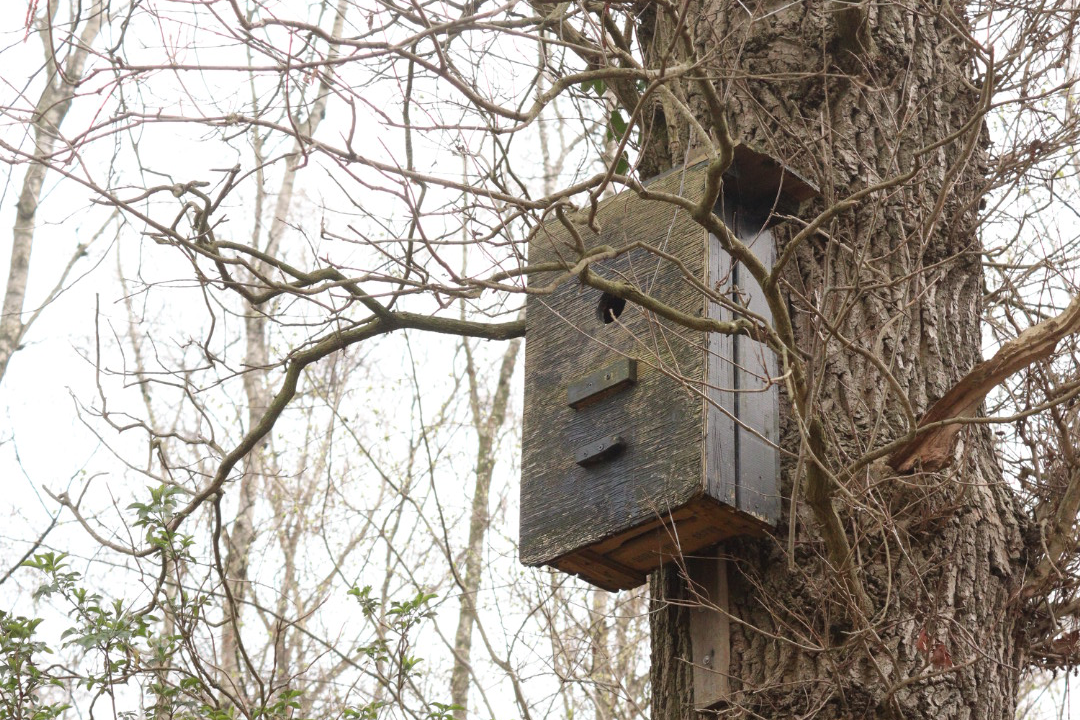 Nadat ik de een grote weg, waar Westernboerderij ‘De Baerle’ aan ligt, ben overgestoken loop ik wederom door smalle bospaadjes, hier loop ik in een ander stukje bos. In dit stuk wordt aandacht besteed aan de vogels. Her en der hangen verschillende vogel- en vleermuizenkastjes.Links van mij is een stukje water waar een eend net uit loopt, recht voor me zie ik verschillende bloemetjes bloeien en rechts hangen verschillende kastjes aan de boom, het voorjaar komt dichterbij! Wederom staat hier een bankje geplaatst door de Vrienden van de Nevelhorst en is de mogelijkheid om te rusten.