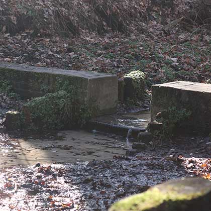 Het geluid van stromend water klinkt in mijn oren. Achter de hoge wal ligt één van de drie uitgegraven bronnen (sprengkoppen) van de Soerense Beek. Dit water dreef drie papiermolens aan die hier vroeger stonden. Een molen is na een brand in 1898 omgebouwd tot wasserij. Wasserij Barth Slijkhuis wast, als enige in Nederland, nog altijd met het kalkarme sprengenwater. Bij deze sprengen loop ik door een houten poort via houten traptreden van boven naar beneden en weer naar boven. Aan mijn linkerhand langs de beek groeit het zeldzame dubbelloof een varen die het goed doet in deze kalkarme omgeving. De winter is langzamerhand plaats aan het maken voor de lente.