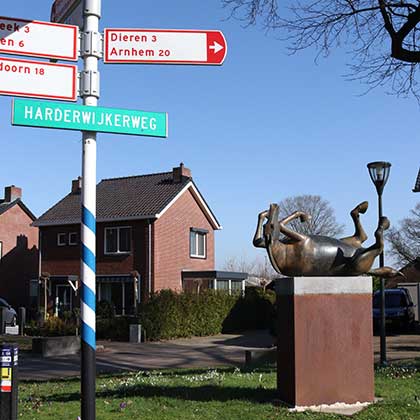 De bushalte De Harmonie aan de Harderwijkerweg in Laag-Soeren is het startpunt van deze route. Bij dit startpunt valt mij direct al wat op. Er ligt een bronzen beeld ‘het rollend paard’ op zijn rug. Dit beeld staat hier ter gelegenheid van het 40-jarig jubileum van de bevrijding. Hiernaast staat de Julianaboom. Deze boom is in 1937 geplant ter ere van koningin Juliana en Prins Bernard. Volg de Harderwijkerweg sla vervolgens af en de natuur begint je verschillende dingen te vertellen. Het water in een beekje naast de weg, met hier en daar nog een dun laagje ijs, weerkaatst de zon in mijn gezicht.