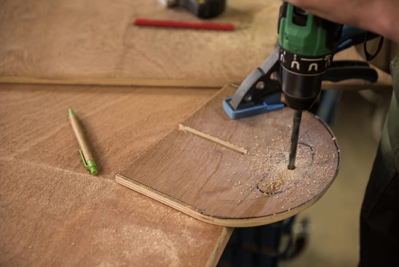 Zaag een plaatje van 250 x 203,5 x 9 millimeter (C); dit is het middenschot met de handgreep. Zet over de breedte een haakse lijn, op 113,5 millimeter vanaf de onderkant; dit is de basislijn. Zaag aan beide zijkanten, van onderaf tot de basislijn, een inham van 4,5 millimeter breed en 113,5 millimeter lang. Zaag in het midden, van onderaf, een inkeping van 9 millimeter breed en 102,5 millimeter lang. Teken nu een ronde vorm, die begint en eindigt op de basislijn. U kunt hiervoor bijvoorbeeld een emmer of een koektrommel gebruiken. Teken op dezelfde wijze het handvat; op het breedste punt meet dit 30 millimeter en boven en onder het handvat is 30 millimeter ruimte. Zaag de ronde vorm en de handgreep. Voor de handgreep boort u eerst een gat van waaruit u met de decoupeerzaag kunt beginnen.