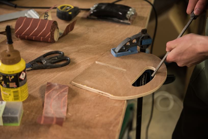 Gebruik een vijl met een ronde en platte zijde en schuurpapier om de randjes van de handgreep mooi rond te maken.