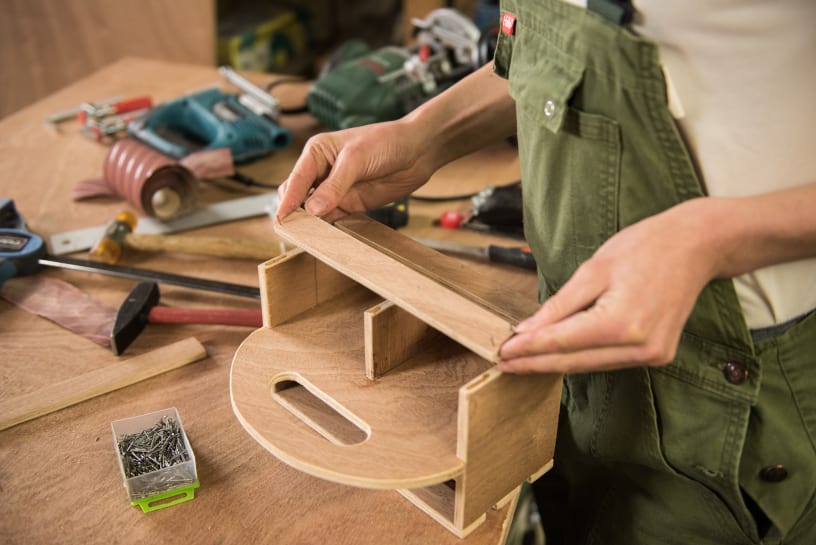 Schuif (D) in de middelste inkeping van (C), lijm en spijker met nagels (C) aan (A). Lijm en spijker vervolgens zijschotjes (B) aan (A) en (C). Gebruik eventueel lijmklemmen om de diverse delen bij elkaar te houden.