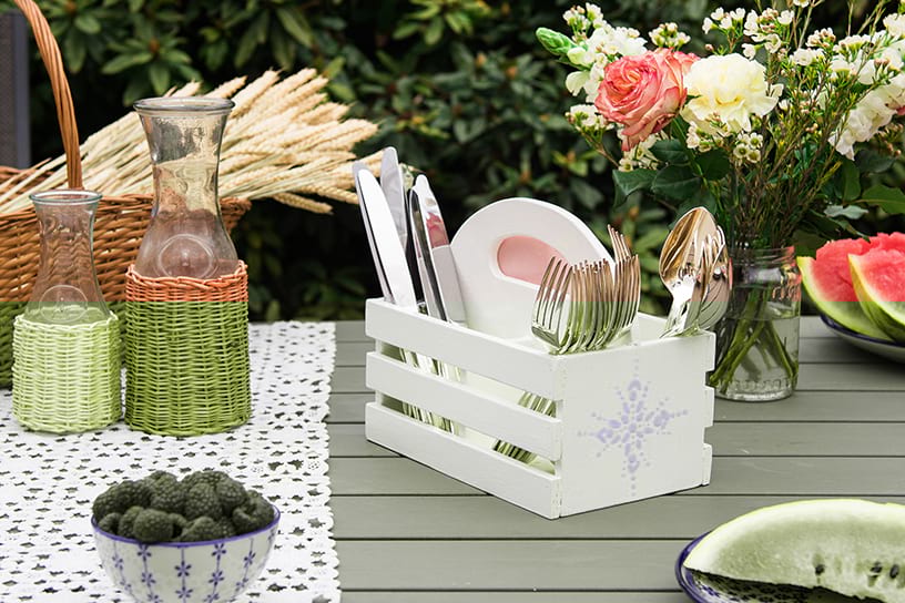 Schuur al het hout glad. Maak de bestekbak stof- en vetvrij. Lak hem af met een laag grondverf en twee lagen lak in de kleur van uw keuze. Laat tussentijds goed drogen en schuur lichtjes op voor u een nieuwe laag aanbrengt.