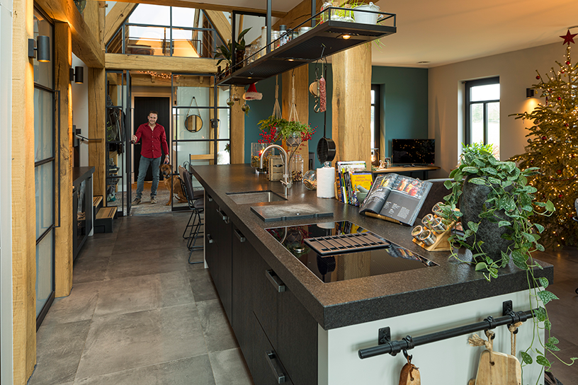 Vanaf het lange kookeiland midden in de grote woonkeuken kijkt Reina lachend toe, terwijl ze de laatste hand legt aan een kerststuk. “We hadden nog een kist met kerstversiering in de opslag staan, maar zelfs toen ik alle ballen in de boom had hangen, was hij nog steeds kaal. Nadat ik nieuwe ballen had gekocht en opgehangen, was het nog te weinig, dus moest ik voor de tweede keer bijbestellen!” Nu het huis is versierd, is het klaar om samen met de familie de feestdagen door te brengen. Jarco: “Het is aan mijn schoonvader te danken dat wij hier wonen. Hij bleef ons aansporen om te gaan bouwen.”