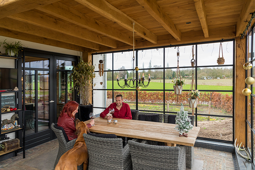 De veranda is zo meer een verlengstuk van de woonkamer geworden. Met dezelfde eikenhouten gebinten, en dezelfde vloer als in de keuken. Jarco: “Wij zijn echte buitenmensen. De veranda was dan ook een harde vereiste, heel belangrijk voor ons. We zijn gek op barbecueën, bourgondisch buitenleven met familie en vrienden. Voor deze maanden zou een heater nog fijn zijn.